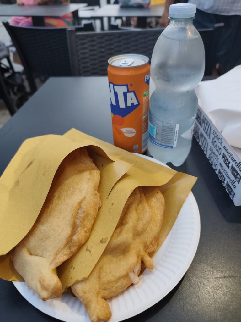 Durante l’attesa c’è una ragazza addetta a smistare le auto per l’imbarco, e dato che qualche tempo prima avevo visto una trasmissione che parlava delle Pucce di Bari vado a chiedergli dove posso trovarne. Risentita mi spiega che le Pucce sono Leccesi e che a Bari devi mangiare O…Panzerotto, e mi spiega dove sul lungomare fuori dal porto devo andare a mangiarne. Sta per Imbrunire a quest’ora sarei dovuto arrivare invece sono tre ore che sto al porto, prendo Trottalemme ( la mia fidata moto e mi reco ) a Lungomare Santa Lucia al locale che mi ha indicato. Prendo 4 panzerotti, due li mangio e due sono uno per Fabio, e uno per la ragazza che non so come si chiama. Torno al porto, e alla domanda come erano, gli do una busta e gli dico dimmelo te. Sono le 23:10 quando apre l’imbarco della motonave ADRIA GNV as Francesca dove mi assegnano la cuccetta 107 e non mi accorgo neanche a che ora siamo partiti, perchè già dormivo.