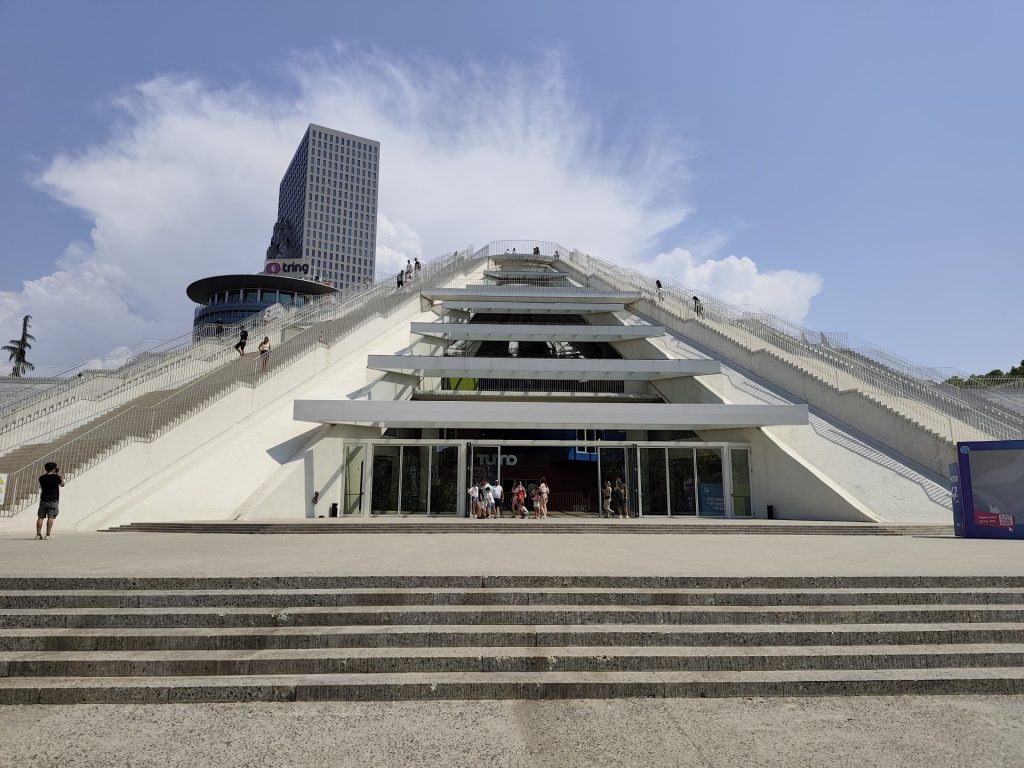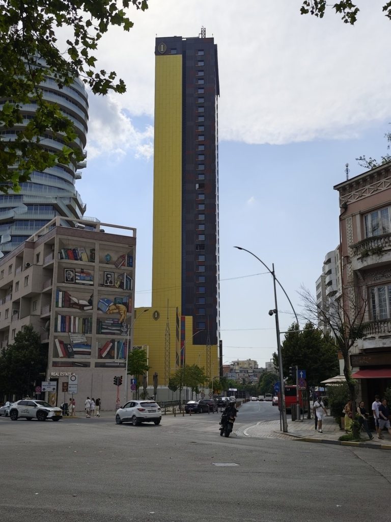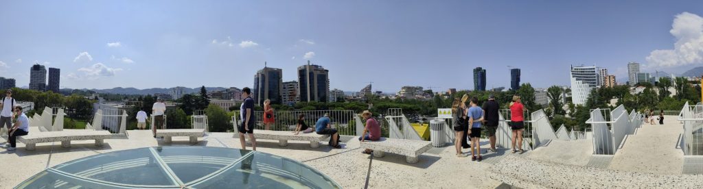 Tirana è una città in forte crescita, ci sono moti lavori in corso e a mio avviso si sta preparando alla grande per l’ingresso in Europa dell’Albania. La prima tappa è la piramide. Per chi aspetta una piramide come quella che intendiamo nel nostro immaginario, resta stupito, perchè si tratta di una struttura moderna dalla quale si ammira un bel panorama della citta. Per chi mi conosce sa bene che camminare a piedi non è la mia passione e una volta arrivato ai piedi della piramide ero molto tidubante se salire o no. Mi so detto chi sa se e quando tornerò a Tirana, e debbo restare con il dubbio se valeva la pena salire? ho impiegato qualche minuto a fare gli scalini della piramide e mi sono anche chiesto perchè non c’è un ascensore. Questa è la piramide e questo è ciò che si vede da sopra. Alla fine scopro che un ascensore c’è ma ha una chiave ed è riservato ai dipendenti dei vari negozi all’interno. Faccio colazione in cima alla Piramide, ammiro il panorama e riposato decido di continuare il tour a piedi.