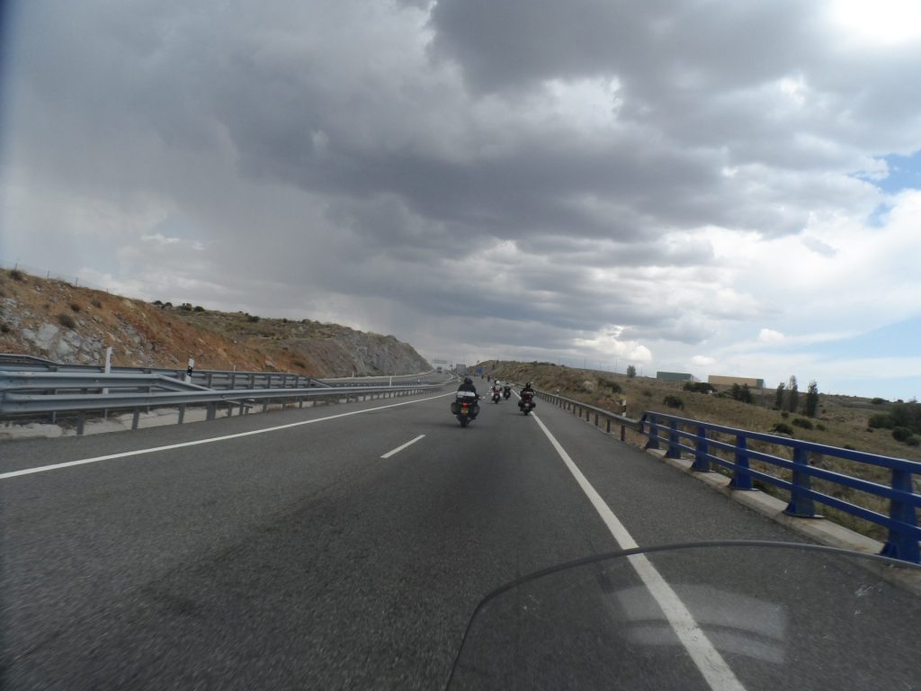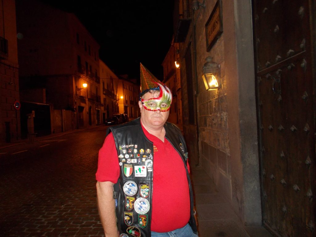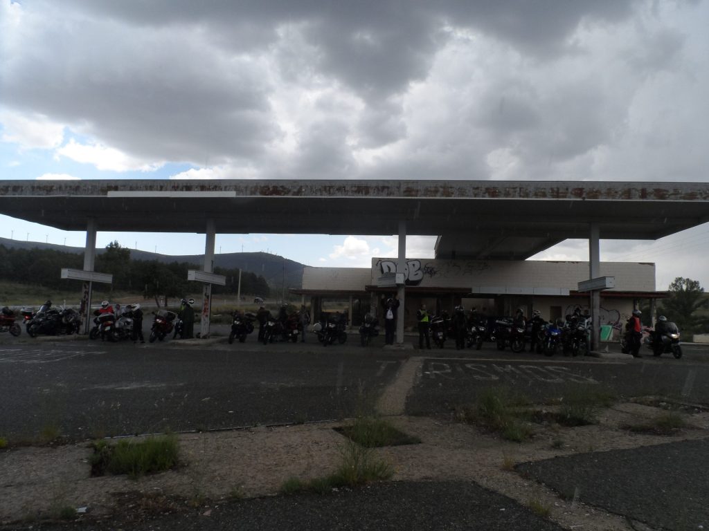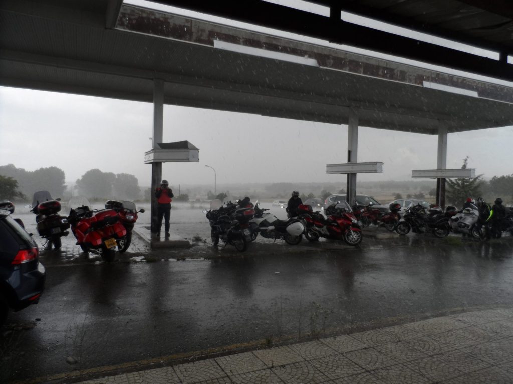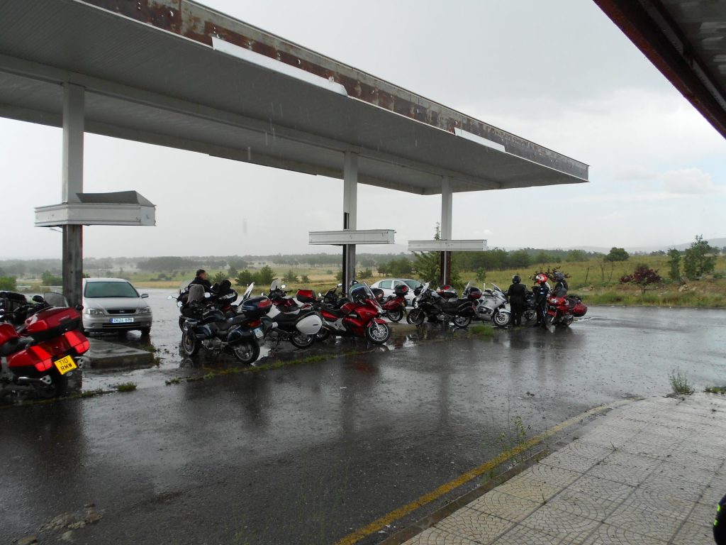 mentre proseguiamo il percorso, da lontano vediamo un muro nero, alcuni che vanno più veloci sorpassano un distributore, noi al centro riusciamo a deviare al volo e ci ripariamo sotto la tettoia, i pochi che hanno dovuto fare inversione e ritornare sono arrivati fradici. Il distributore era dismesso, pertanto non davamo fastidio, e siamo rimasti una mezz’ora il tempo che il temporale passasse.(40.74903, -4.45827) Torniamo a Segovia perchè oggi abbiamo la cena di Gala.