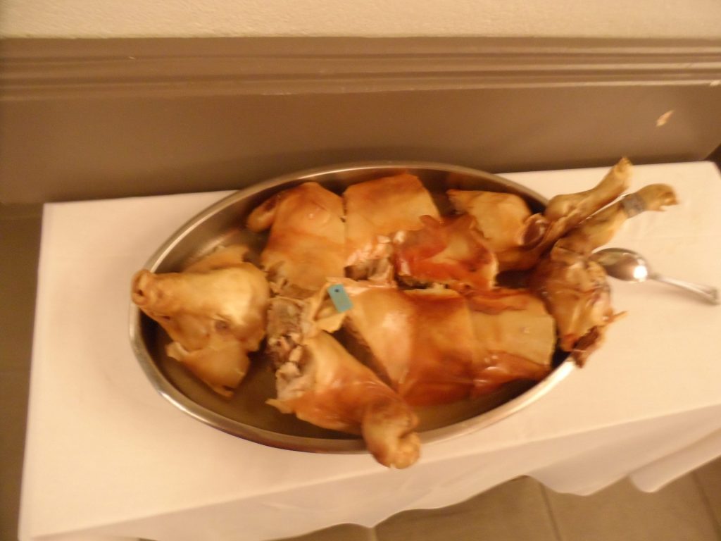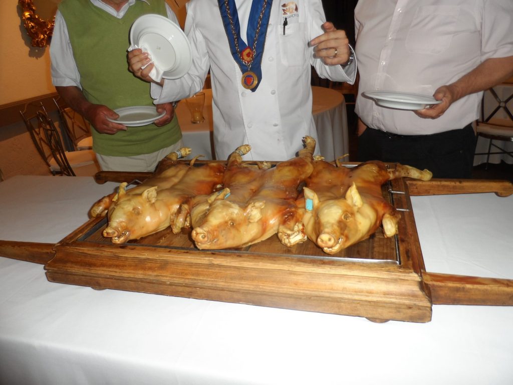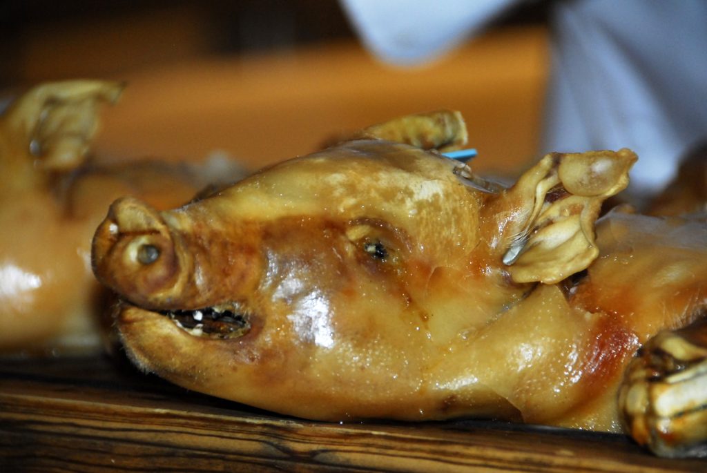 Finalmente esce il cuoco con i porcellini arrosto, che è usanza data la loro tenera carne, tagliarli con il bordo di un piatto per poi rompere i piatti in terra, altro tempo perso per pulire, prima di mangiare.